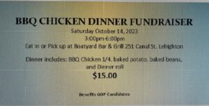 Please join us Saturday October 14, 2023 for the BBQ CHICKEN DINNER FUNDRAISER event benefiting our 2023 Municipal Election GOP Candidates.